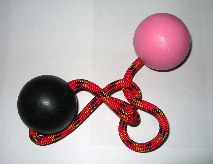 Loosen the left side of the square knot, forming a loop which is pulled over the black ball. As an ALTERNATE first step, the diagram below can also be reached by pulling a loop from the left side of the square knot and threading the pink ball under it! Using this alternate technique no ropes will pass around the black ball. However, it is more difficult to remember how to reverse the steps.